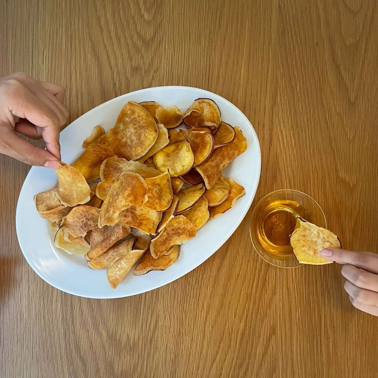 甘塩っぱく味付けしたオリジナルの芋蜜のこと。その蜜を素揚げしたチップスにかけてお召し上がりいただきます。パリパリの食感は一度食べると止まりません。